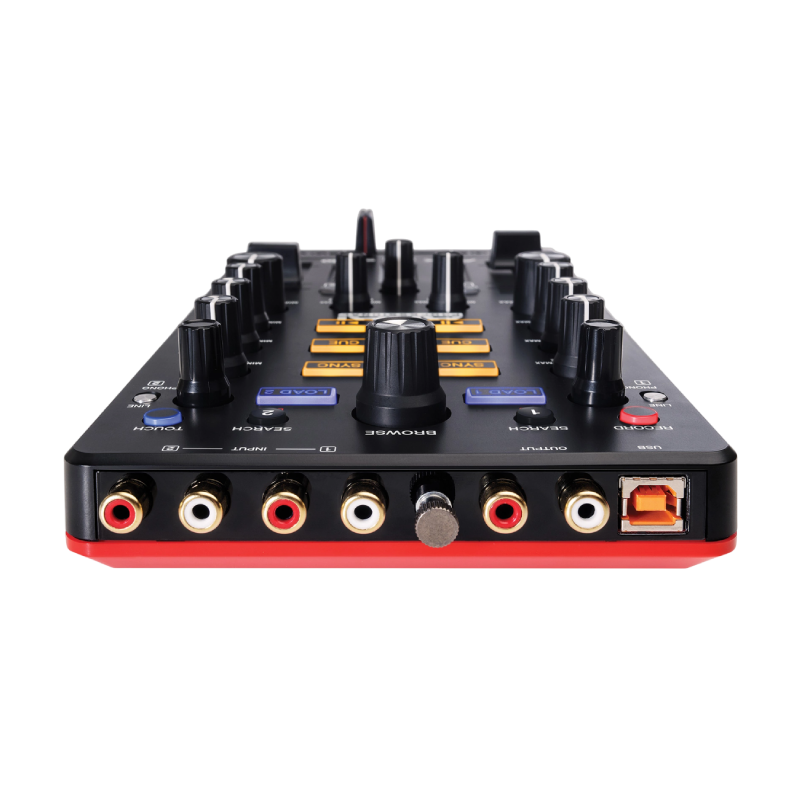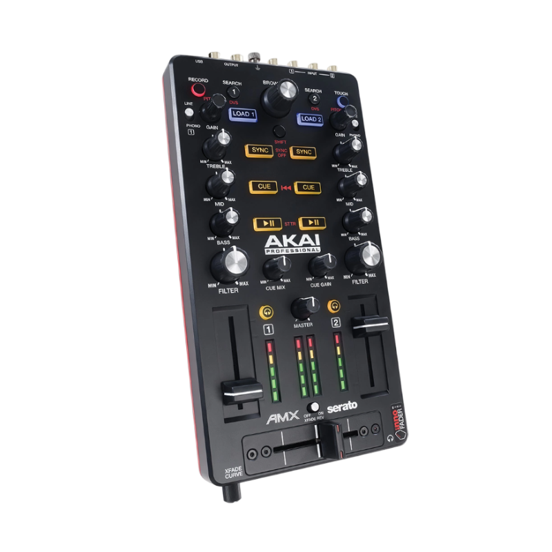 The Akai Pro AMX is a compact, two-channel DJ controller with 9 touch-activated knobs for EQ kills and Filter sweeps. Use this portable controller alongside the Akai Pro AFX, turntables or CDJs with its two sets of phono/line inputs.