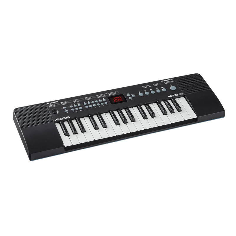 - 32 mini piano-style keys with built-in speakers - 300 built-in tones - Accompaniment mode with 300 built-in rhythms - Play along with 40 demo songs or record your own